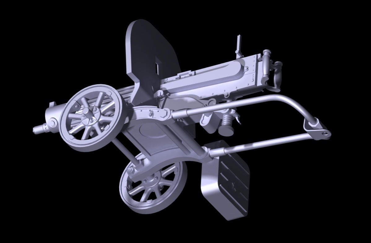 Детализированный сборный колёсный станок, проработанная казённая часть, кожух ствола с продольным рифлением, прицел, короб с лентой патронов.
