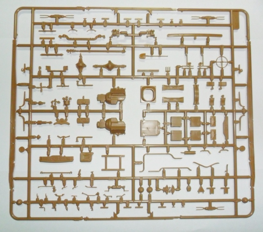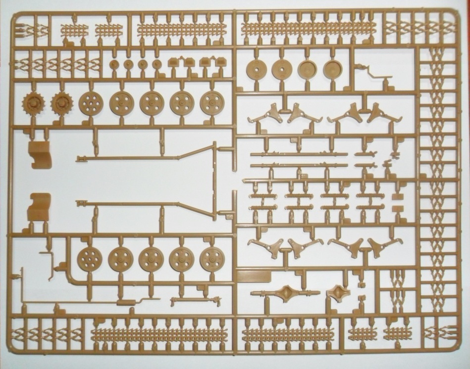 Детализированный гусеничный привод, пластиковая наборная гусеничная лента с прямыми участками, выполненными единой деталью, сборная несущая рама, выхлопная система выполнена отдельной деталью.