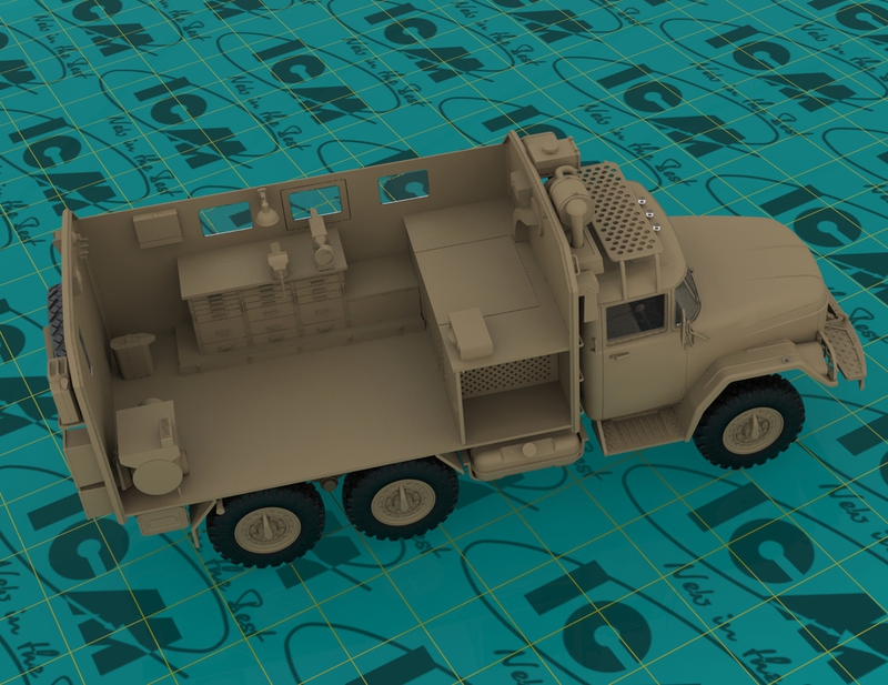 Детализированная подвеска, сборная несущая рама, детально проработанная ходовая часть, раздаточная коробка, карданные валы, мосты, рессоры, выхлопная система выполнена отдельными деталями.