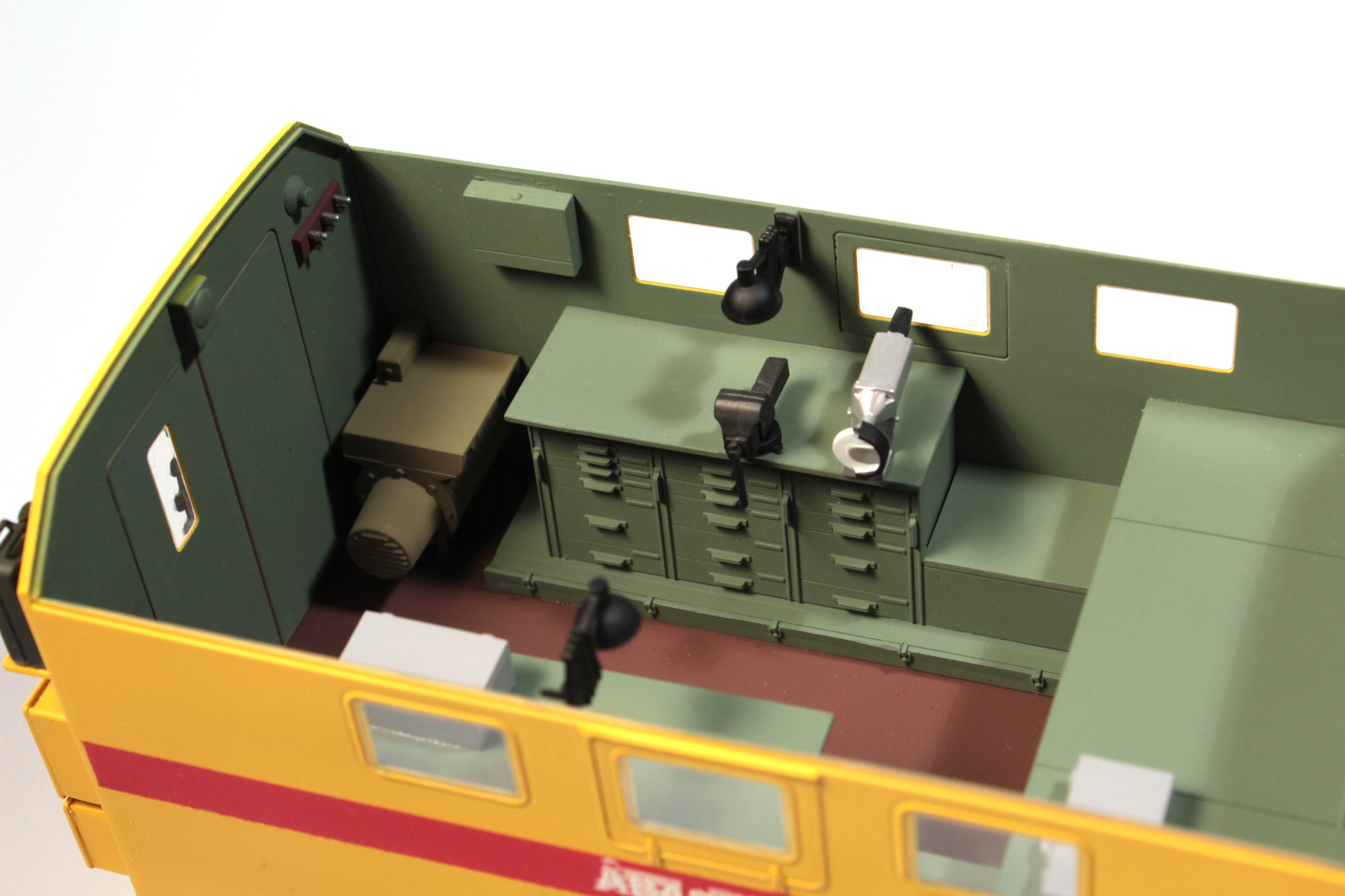 Детально проработанная сборная кабина с сиденьями, приборной панелью, элементами управления, внутренняя обшивка дверей выполнена отдельными деталями.