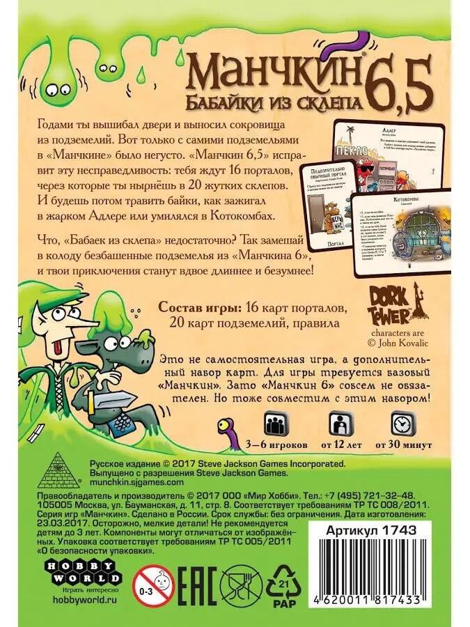 "Манчкин 6,5: Бабайки из склепа" – это небольшое дополнение, которое, однако, добавляет в игру новую механику и очень сильно расширяет игровой процесс! Оно похоже на "Манчкин 6. Безбашенные Подземелья" и является его логическим продолжением. Теперь в игре появляется новый формат карт – подземелья (в этой версии – склепы), которые лежат себе в сторонке и задают тон всему вашему приключению, ведь именно по этому данжену вы и будете передвигаться! Каждый данжен обладает специальными свойствами, которые работают на всех игроков! Например, данжен "Котокомбы" дают бонусы Котейкам, игроками с кошачьими фамилиями или с кошачьими ушками на голове, а также усиливают всех монстров, в чьих именах есть буквы "К", "О" и "Т"!