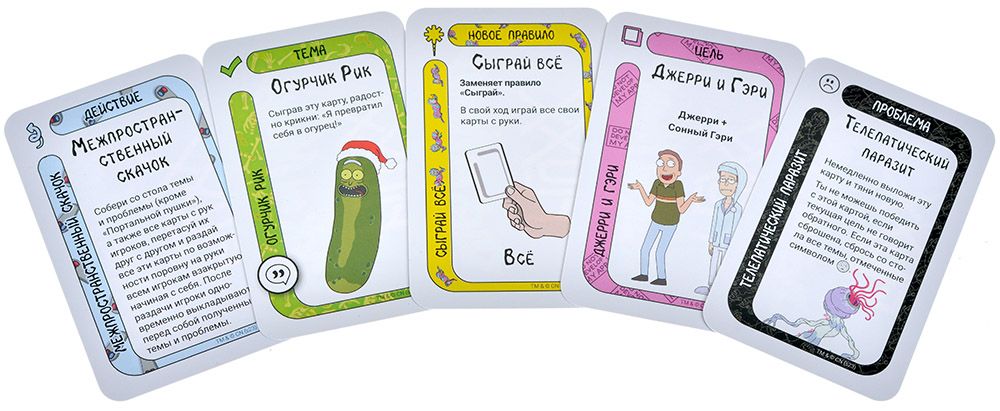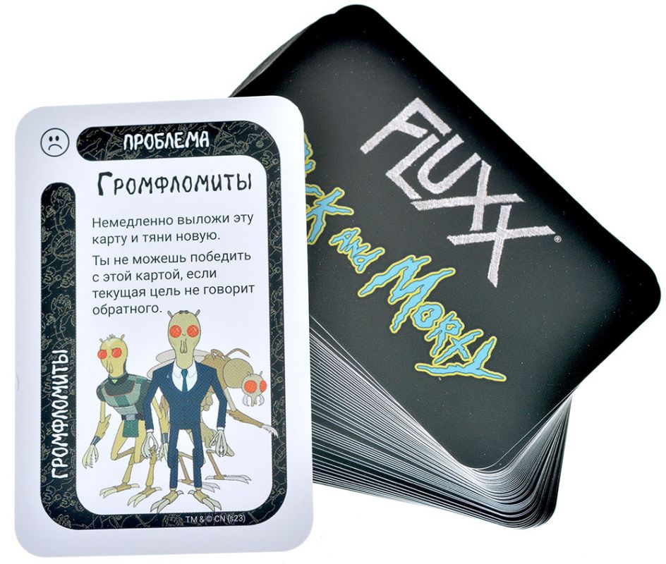"Fluxx: Рик и Морти" – орикенное приключение на 15 минут для самых безумных риконавтов! Тяните карту, играйте карту и спасайте безумную и хаотичную вселенную! Но помните, что правила могут измениться в любой момент, и тогда прыгайте в чан с фальшивой кислотой! Ну, или по ситуации.