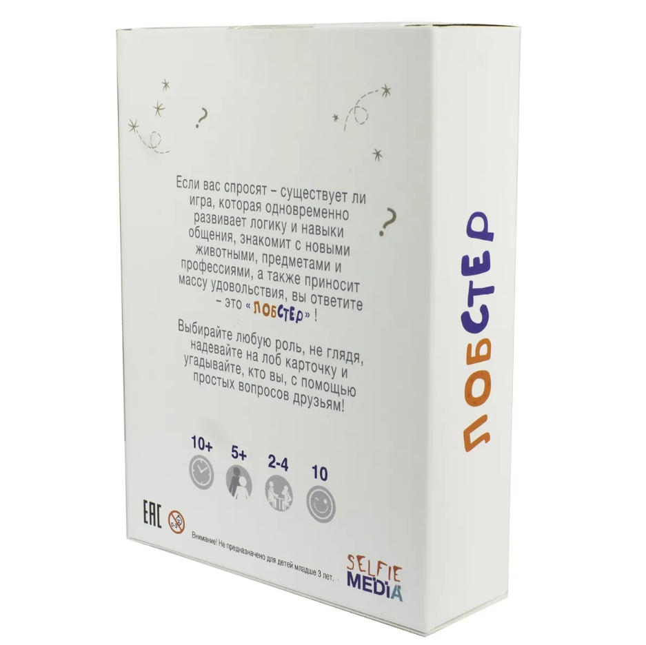Лобстер - игра от молодого отечественного бренда Selfie Media уже зарекомендовавшего себя на рынке настолок. В начале игры все участники берут себе из колоды карту и закрепляют на лбу. Суть игры – с помощью простых вопросов другим участникам понять, что изображено на вашей карте.